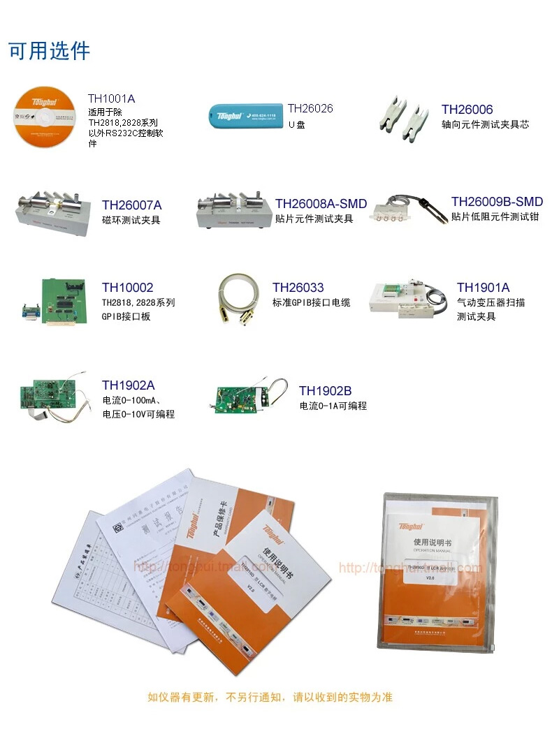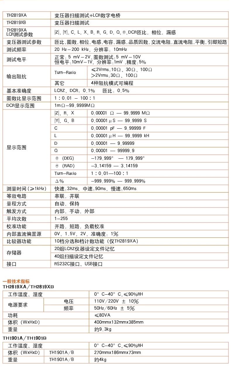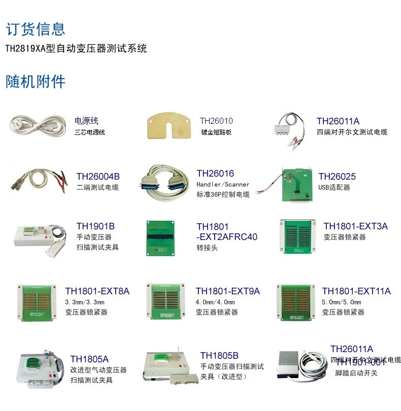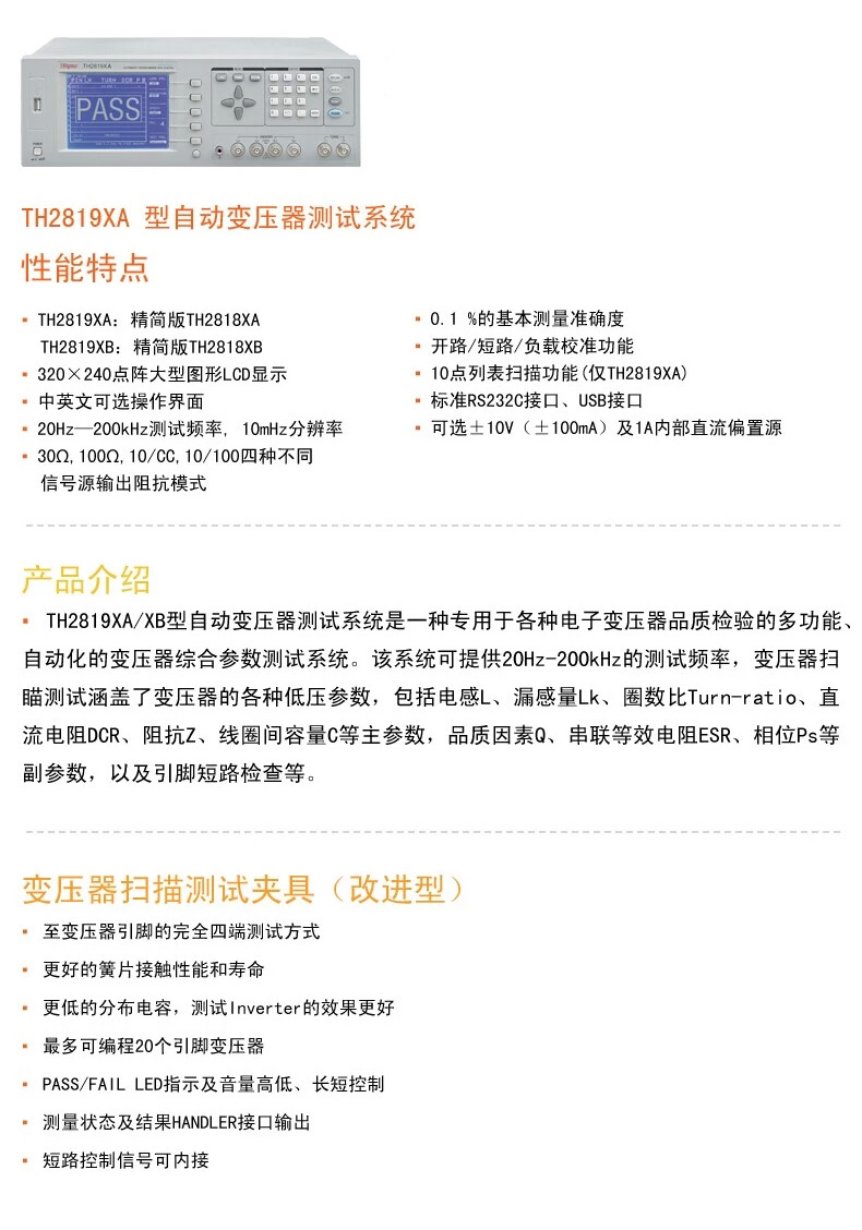 TH2819XA/XB型 自动变压器测试系统是一种于各种电子变压器品质检验的多功能、自动化的变压器综合参数测试系统。该系统可提供20Hz-200kHz的测试频率,变压 器扫瞄测试涵盖了变压器的各种低压参数,包括电感L、漏感量Lk、圈数比Turn-ratio、直流电阻DCR、阻抗Z、线圈间容量C等主参数,品质因素 Q、串联等效电阻ESR、相位Ps等副参数,以及引脚短路检查等。