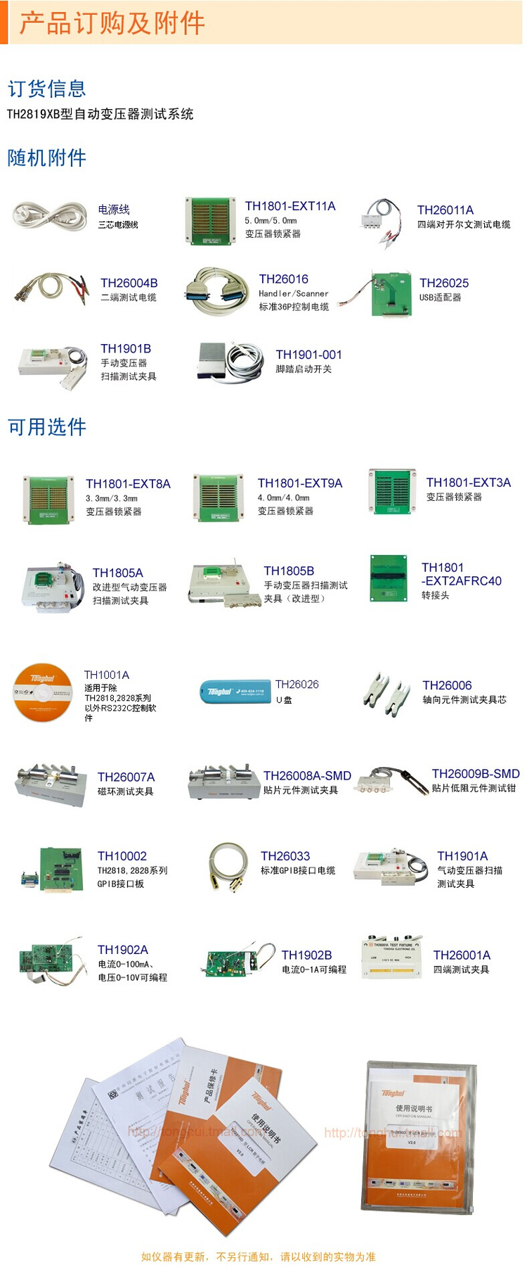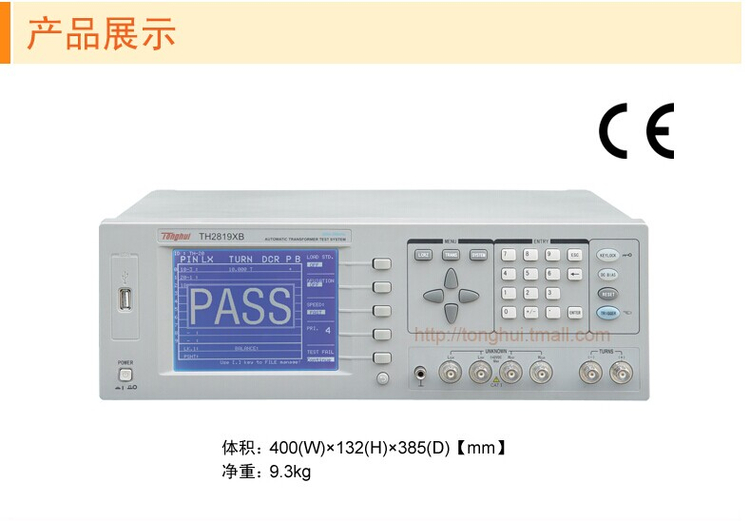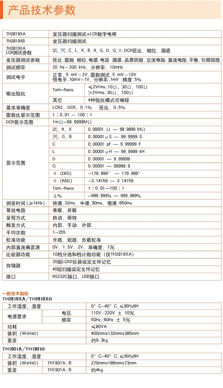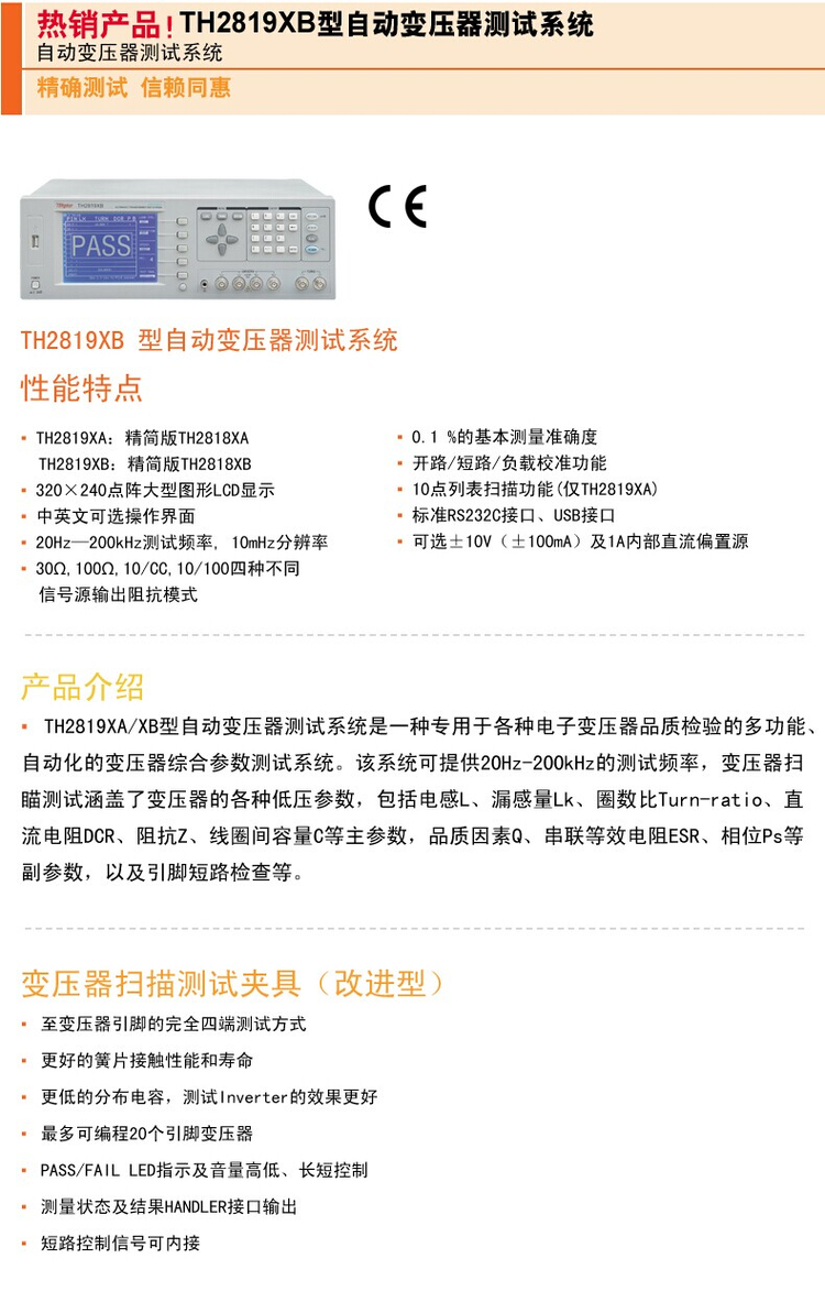 ■TH2819XA/XB型 自动变压器测试系统是一种于各种电子变压器品质检验的多功能、自动化的变压器综合参数测试系统。该系统可提供20Hz-200kHz的测试频率,变压 器扫瞄测试涵盖了变压器的各种低压参数,包括电感L、漏感量Lk、圈数比Turn-ratio、直流电阻DCR、阻抗Z、线圈间容量C等主参数,品质因素 Q、串联等效电阻ESR、相位Ps等副参数,以及引脚短路检查等。