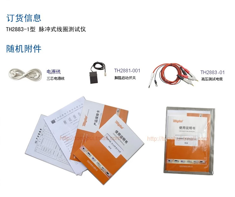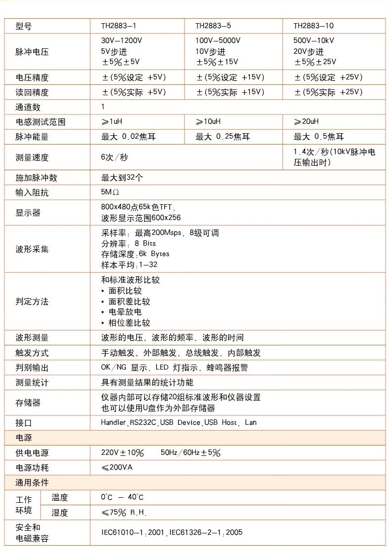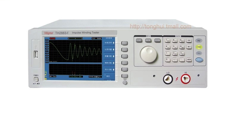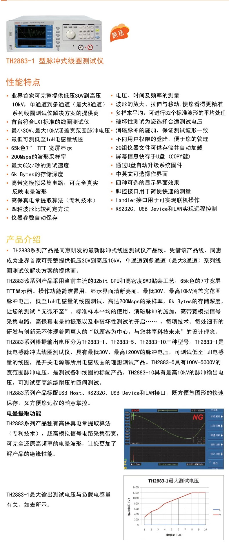 ■ TH2883系列产品是同惠研发的新一代脉冲式线圈测试仪,共有四个型号组成。该系列产品采用当前主流的32bit CPU和高密度SMD贴装工艺,65k色7寸宽屏TFT显示器。操作功能简洁易用,显示界面清新亮丽。10kV脉冲电压、多8通道扫描测试、低至1uH电感量的线圈测试、200Msps的采样率,6k Bytes的存储深度、标准样本平均的使用、消磁脉冲的施加、高保真电晕的提取以及非破坏性测试的开启…… ,无不彰显在业界的地位。TH2883系列共有四个型号;TH2883-1是低电感脉冲式线圈测试仪,具有低30V的脉冲电压,可测试低至1uH电感量的线圈,是开关电源等用电感线圈的理想测试产品。
