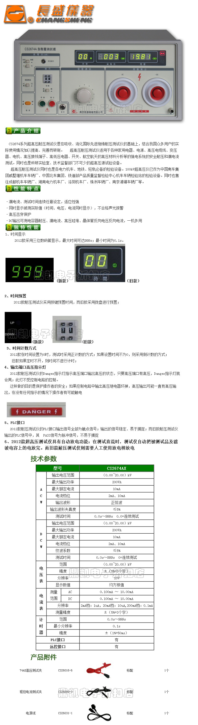 南京长盛交直流耐压测试仪CS2674AX BX CX 20KV厂家直销