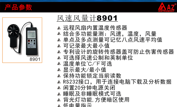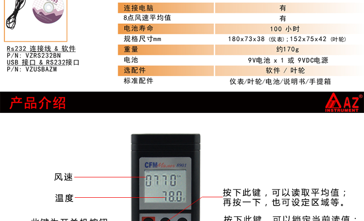 台湾衡欣分体式数字风速计风量计风温风速仪表连接电脑分析AZ8901
