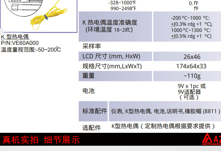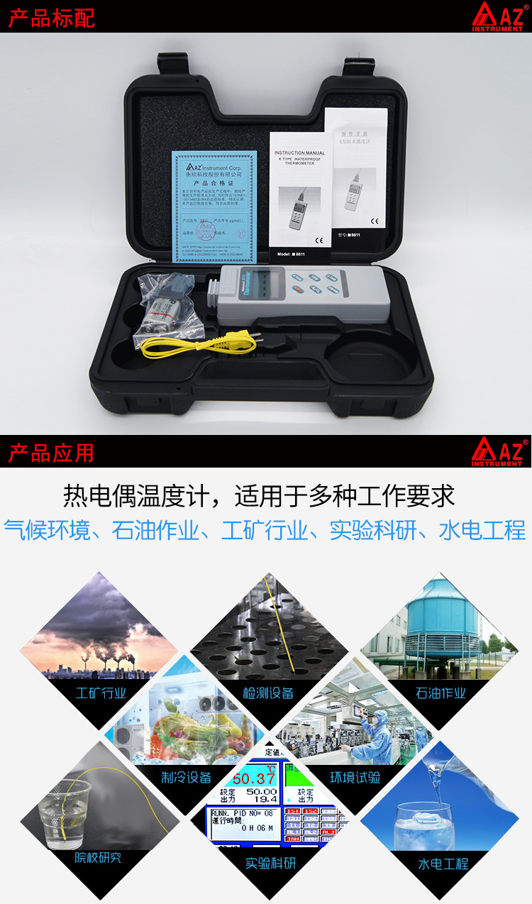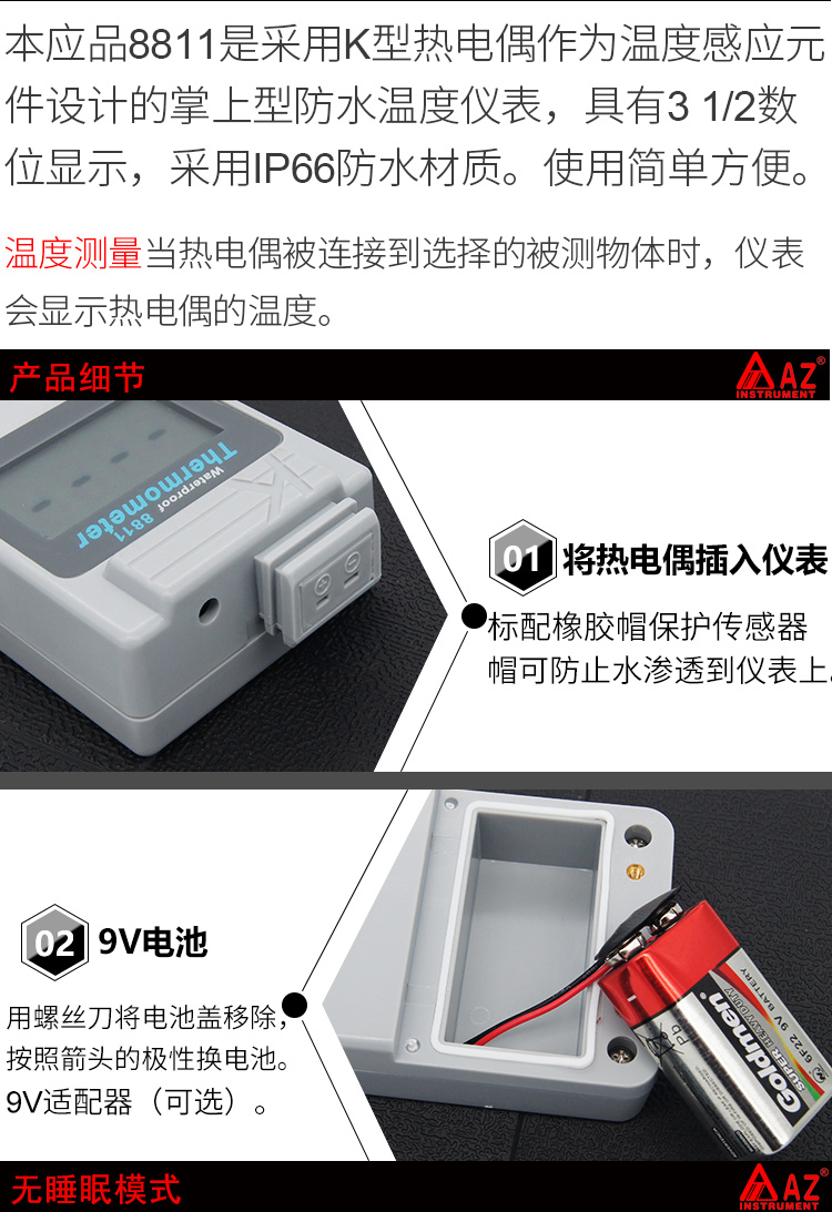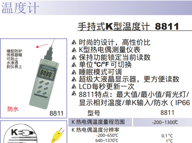衡欣手持式K型温度计防水型温度表AZ8811数显测温仪K型热电偶测量