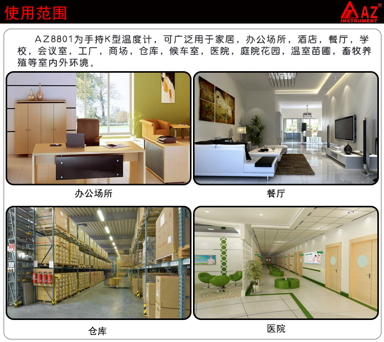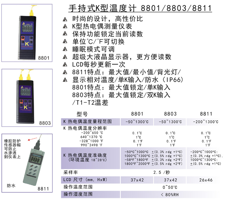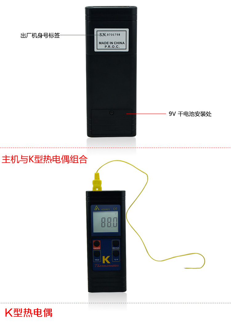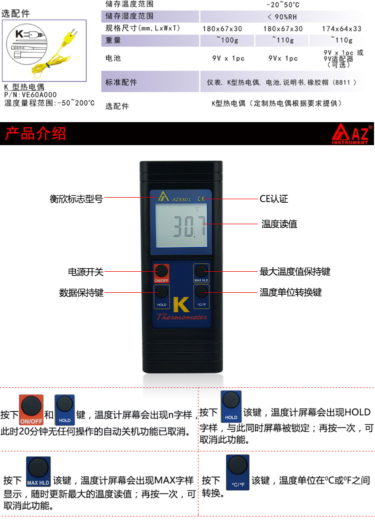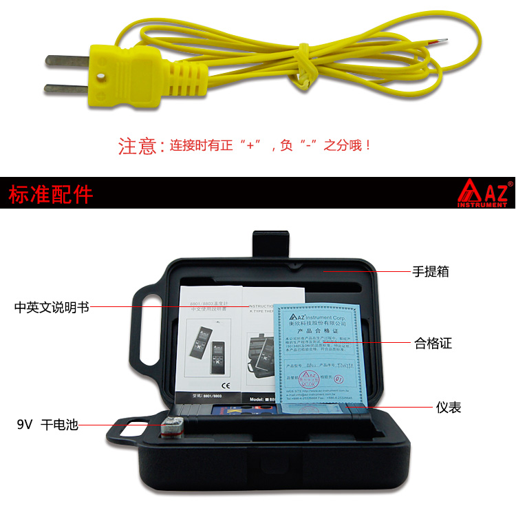 台湾衡欣单通道数字温度计 接触式温度表 K型热电偶测温仪AZ8801