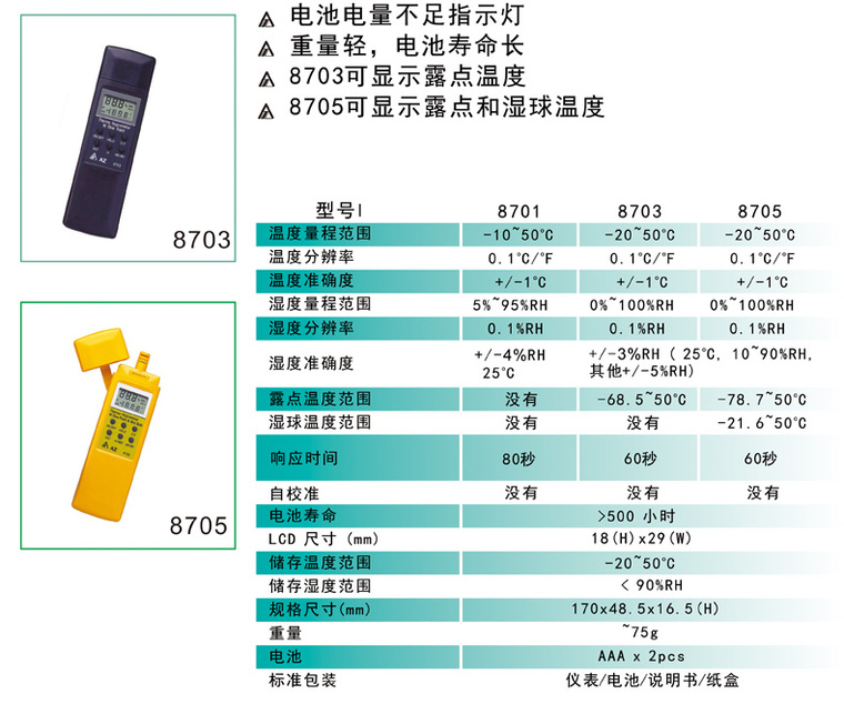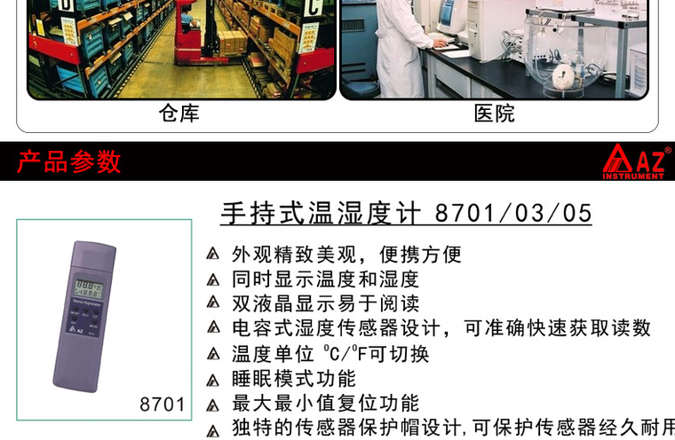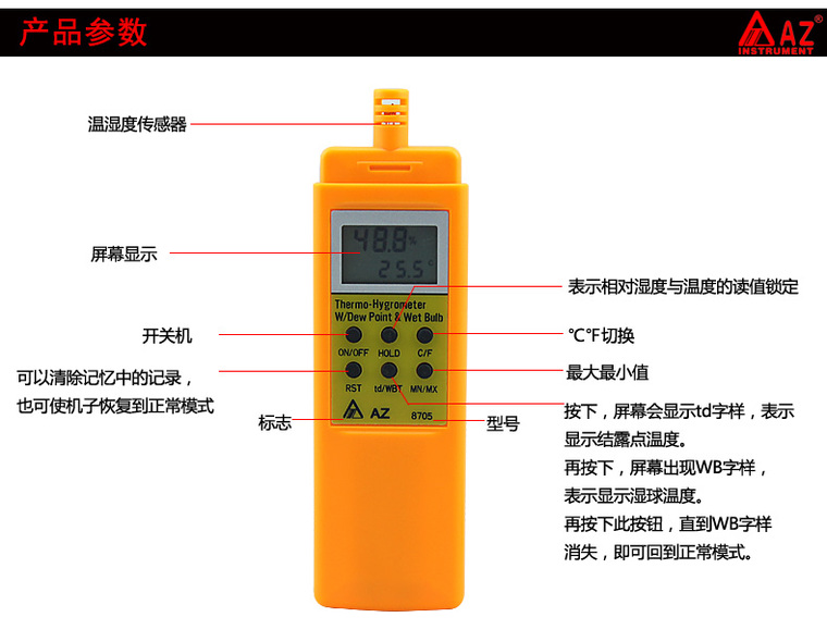 台湾衡欣 AZ8705手持温湿度计 工业温湿度 露点 湿球温度测试仪