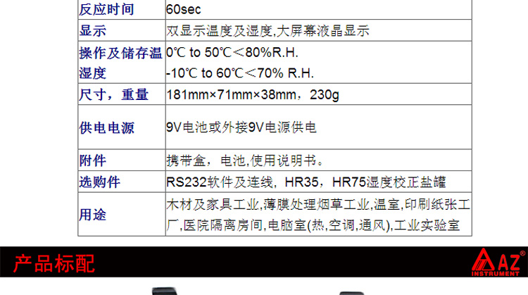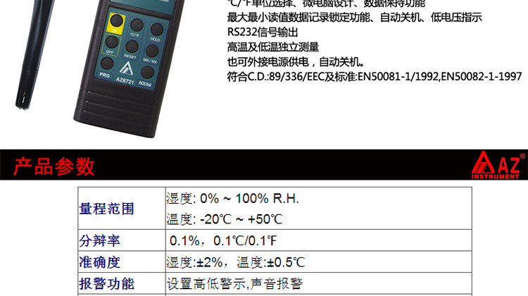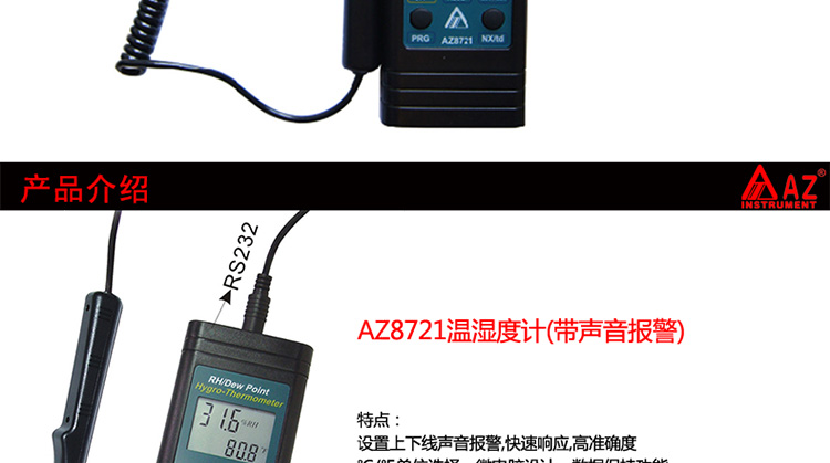 台湾衡欣 AZ8721分体式温湿度计温湿度露点仪带报警数字湿度计