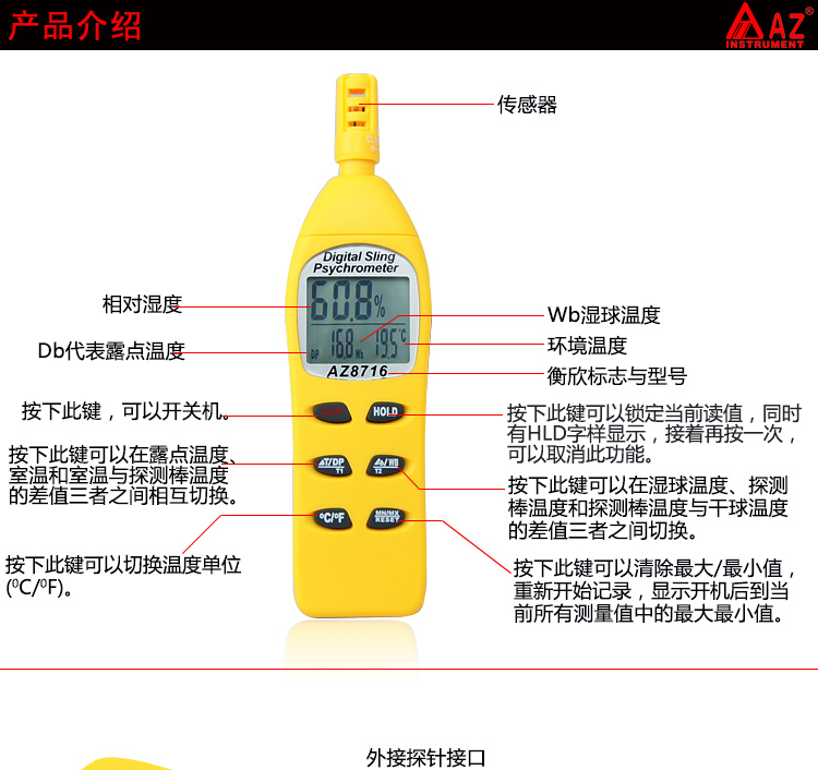 衡欣 AZ8716手持式高精度温湿度计 数字温度计湿度仪工业用