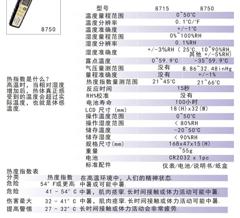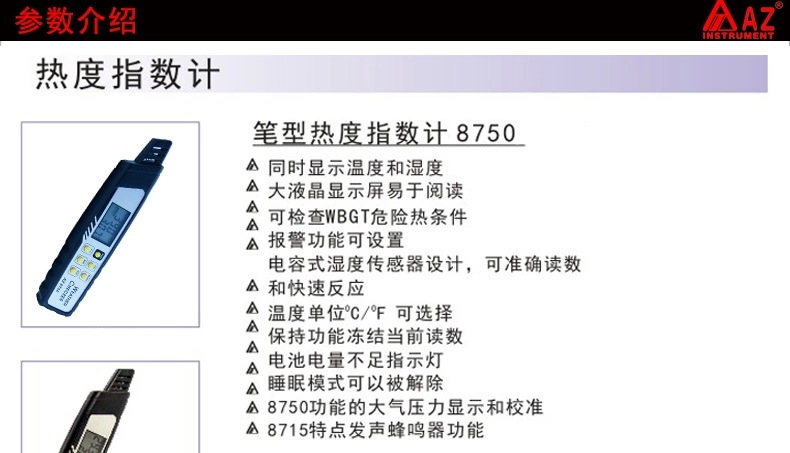 衡欣 AZ8750笔式炎热指数计 温度计 湿度计 热度指数计气压仪