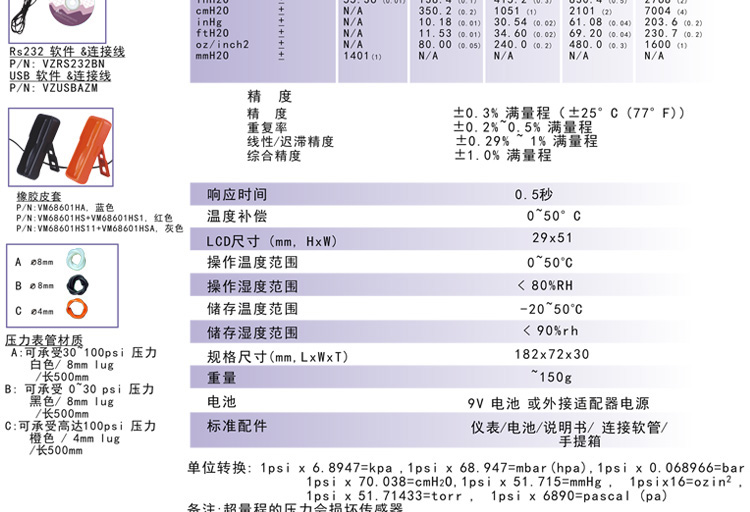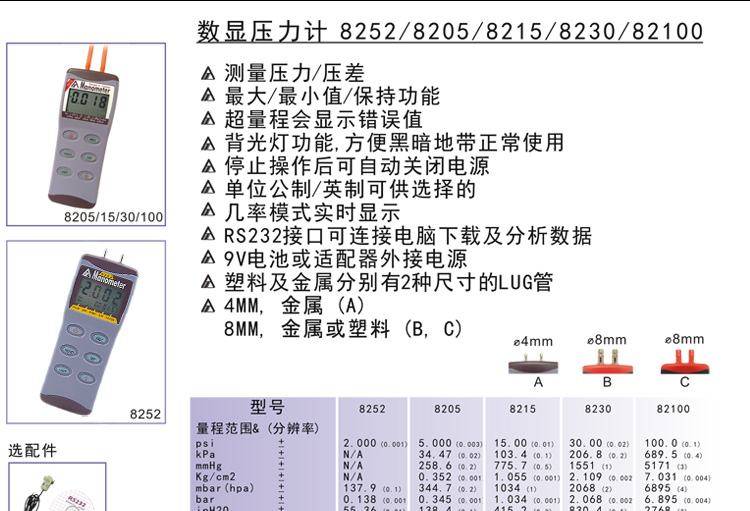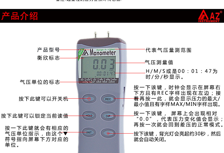 台湾衡欣 AZ8230精密电子压力计 数字压差计 压差表 压力万用表