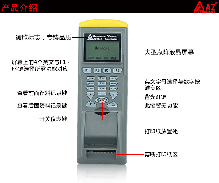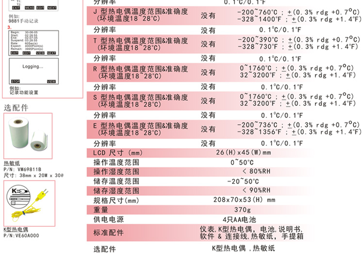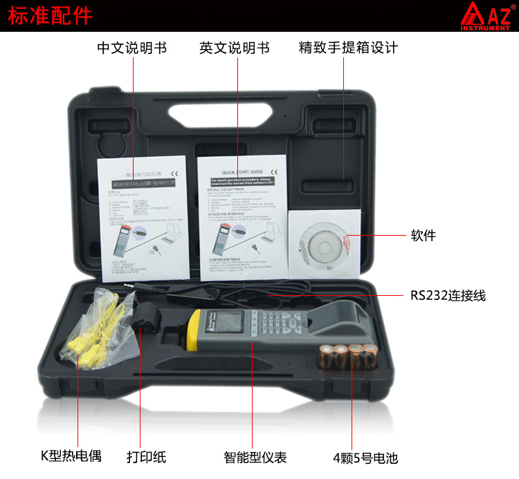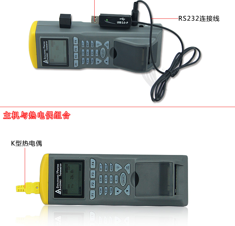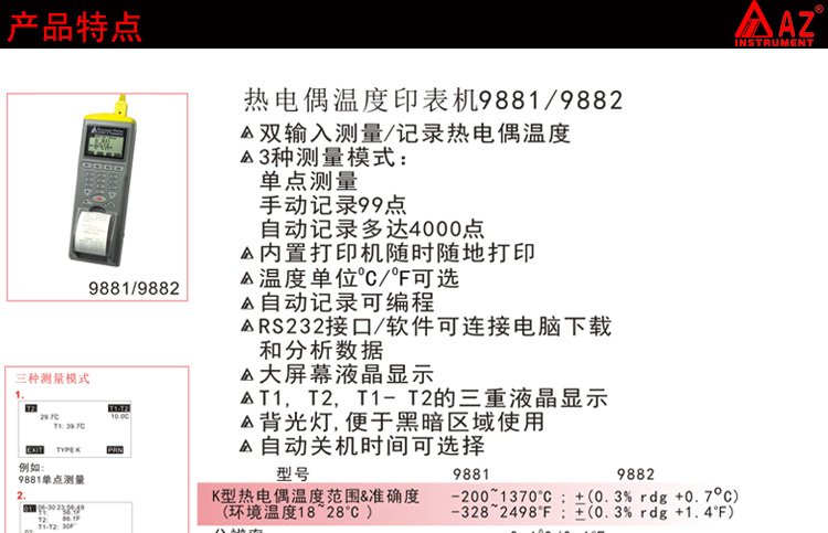 台湾衡欣 AZ9881高精度双热电偶温度记录仪 温度记录仪器带打印