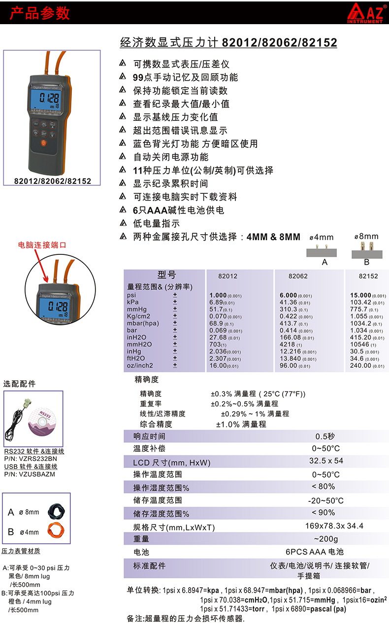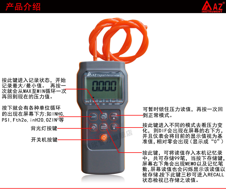衡欣 AZ82062 数显压力计 压差仪 电子压力表 高精度负压计