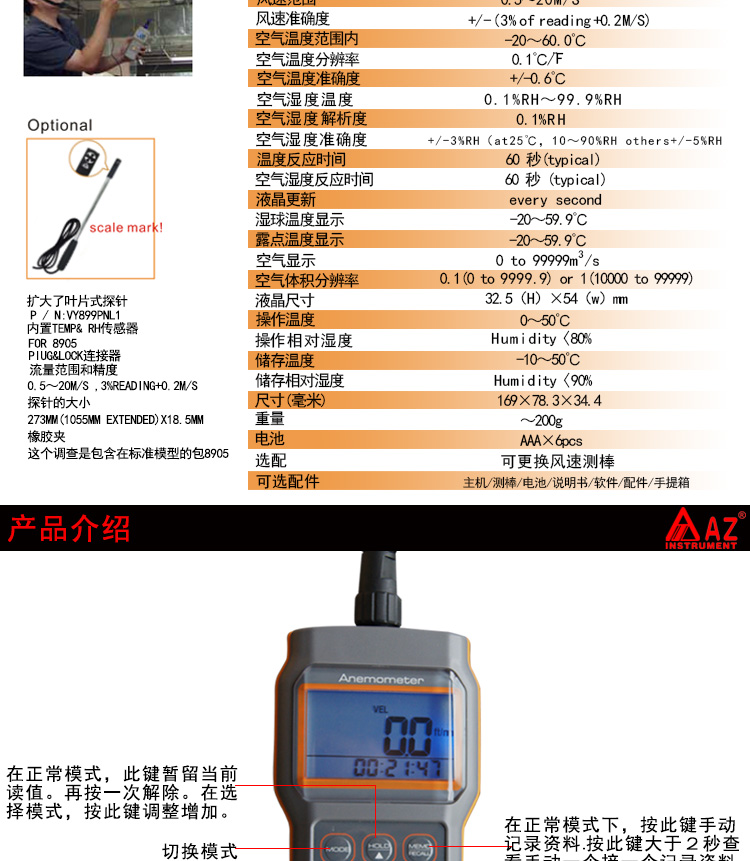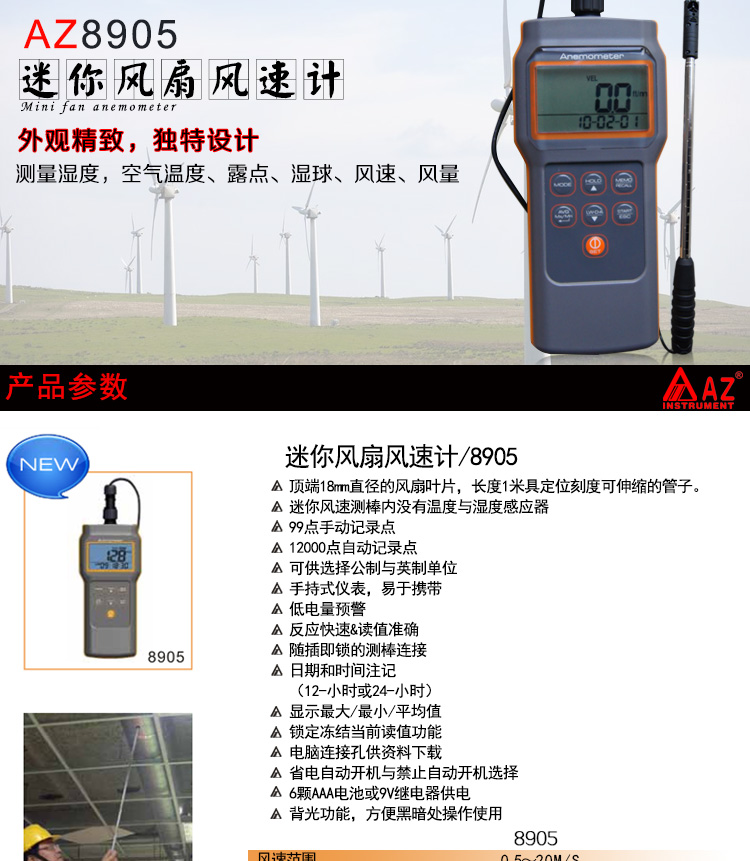 台湾衡欣 AZ8905多功能风速仪 测量温湿度 露点 湿球 风速 风量计