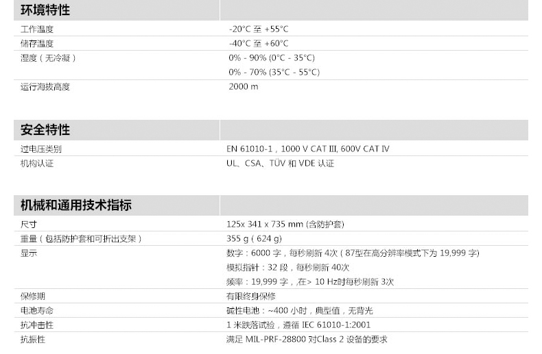 新推出的Fluke 87V/C大大改进了测量功能、诊断功能、分辨率和精度,能够更多地解决马达驱动、工厂自动化设备、配电和机电等设备的故障。80V系列多用表经过第三方独立测试,完全满足ANSI/ISA S82.01第二版和EN61010-1 CAT IV 600V/CAT III 1000V标准的要求。可以承受8,000 V以上的电压脉冲,大大降低了浪涌和击穿的危险。