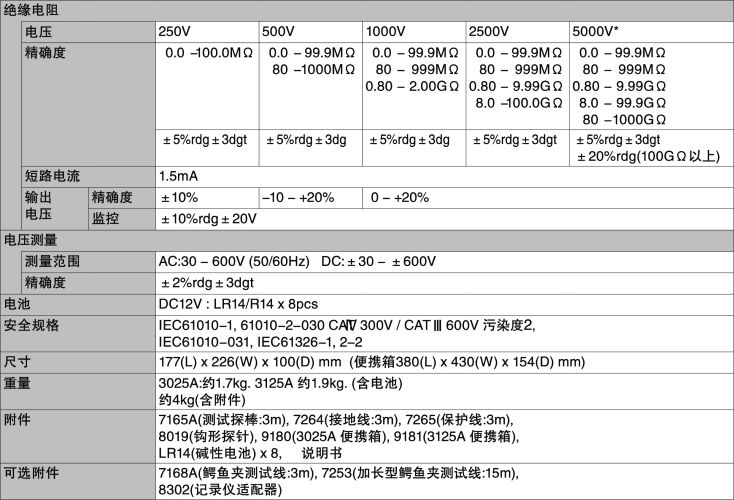 250V/500V/1000V/2500V(KEW 3025A)。