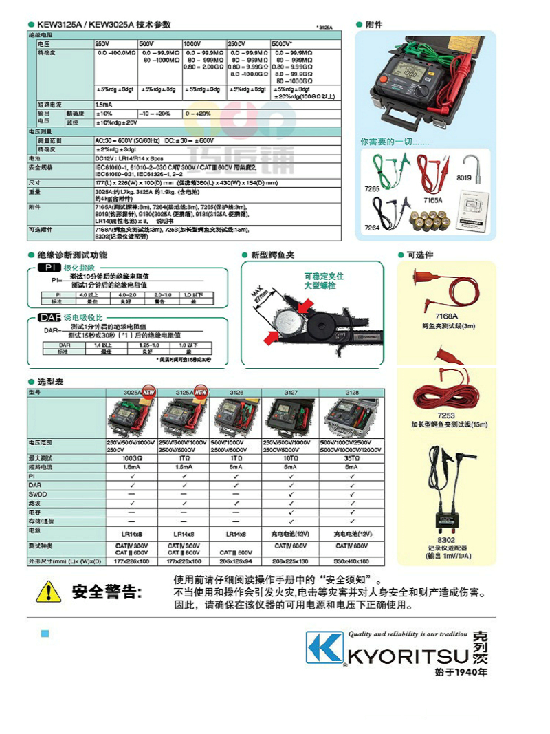 测试电压范围为 250V/500V/1000V/2500V/5000V(KEW 3125A)。