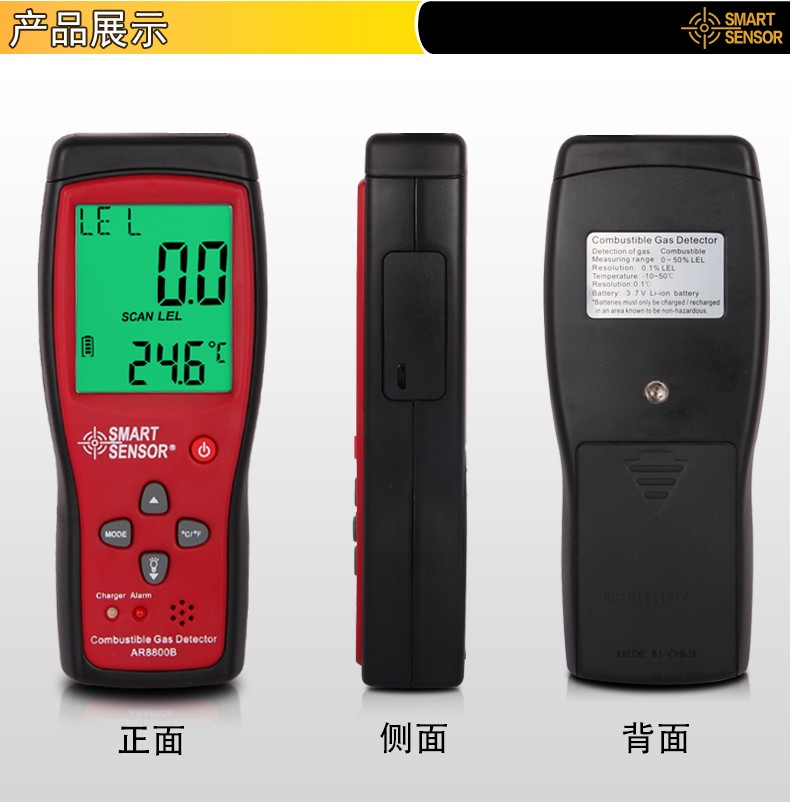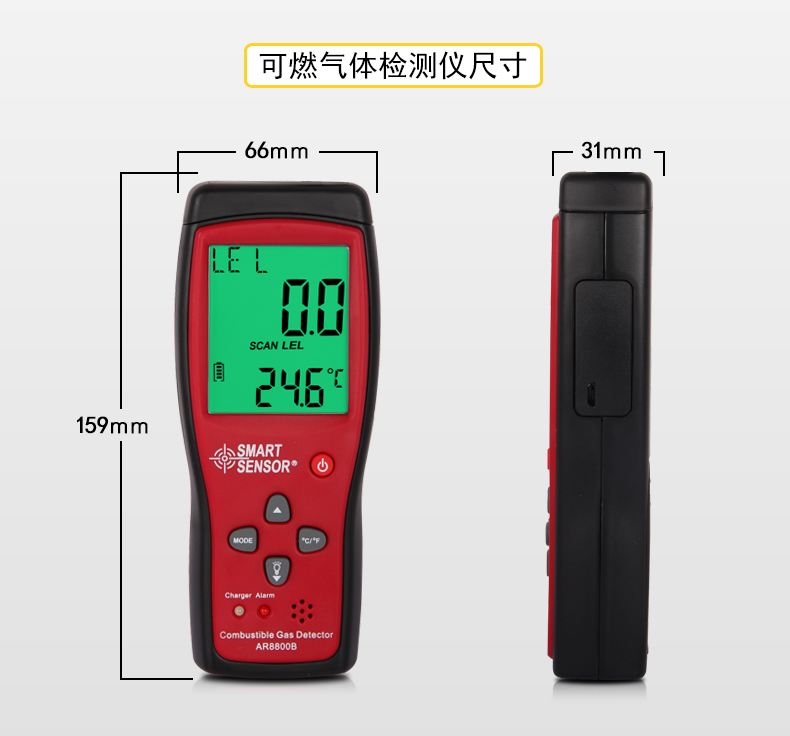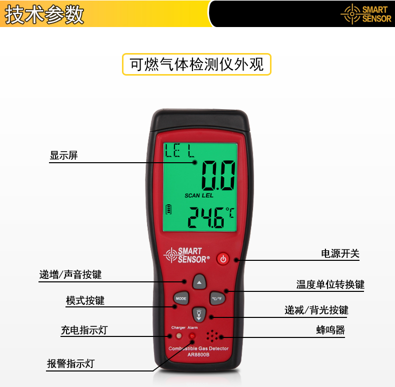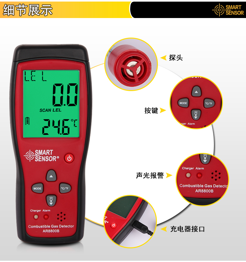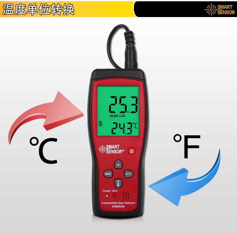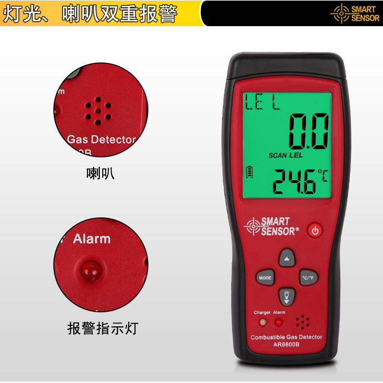 声、光双重报警,可以设置报警值,报警声可达80分贝
