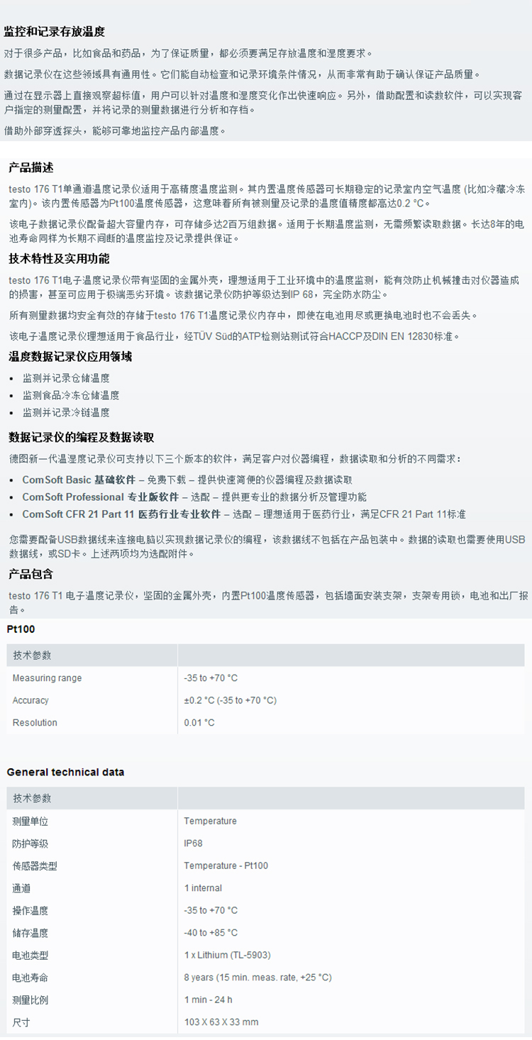 德图TESTO176T1电子温度记录仪单通道内置探头德国货号0572 1761