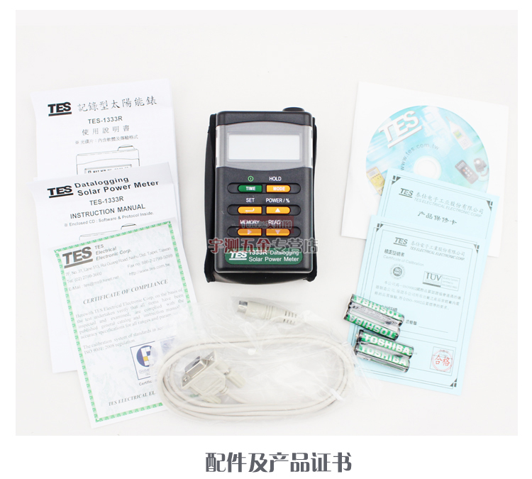 皮套、使用说明书、4只1.5V电池、RS232介面缆线(TEA-1333R)及光碟软体(TES-1333R)