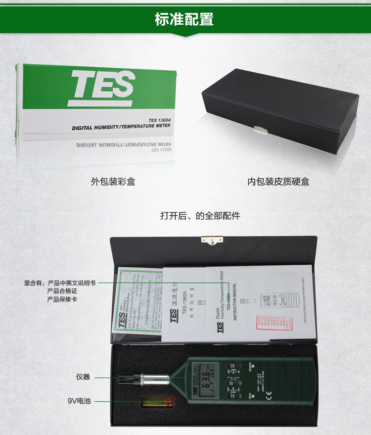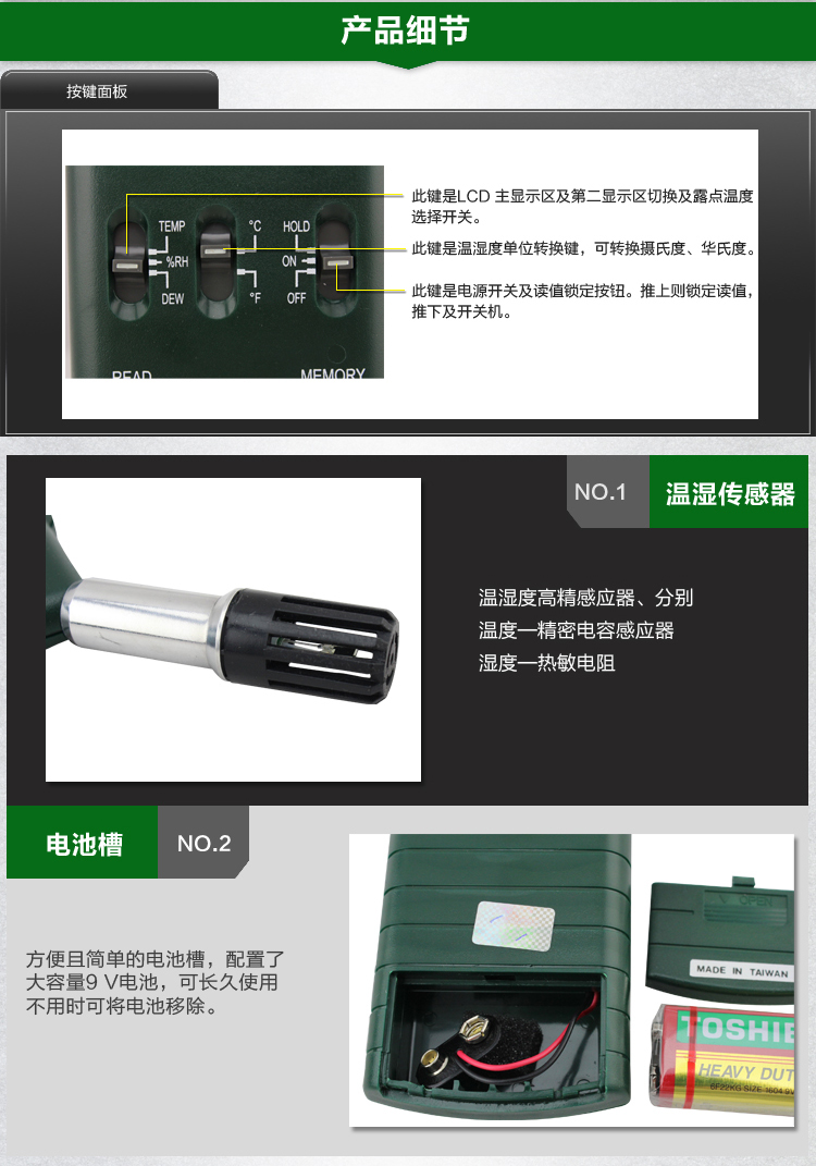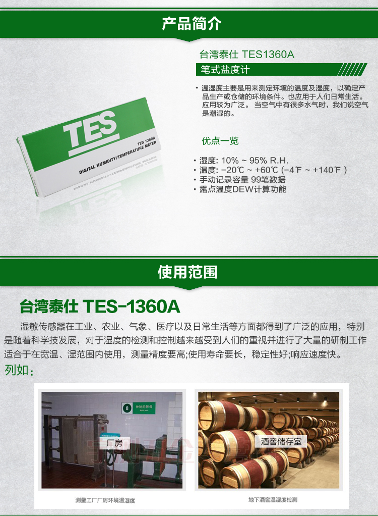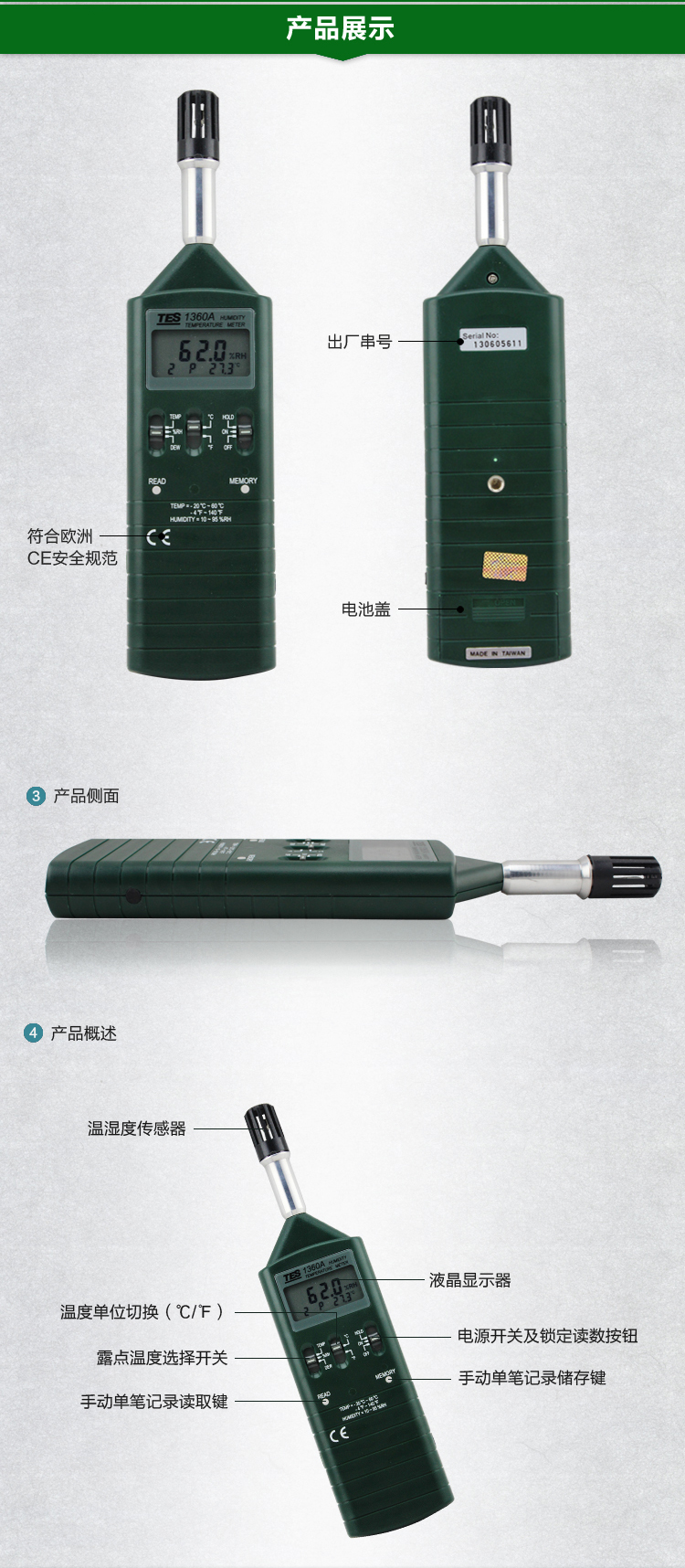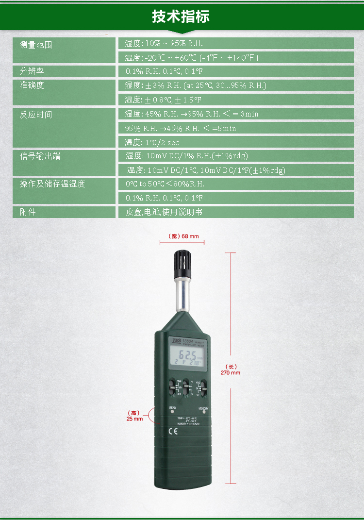 湿度: 10% ~ 95% R.H. 温度: -20℃ ~ +60℃ (-4℉ ~ +140℉ ),手动记录容量 99笔数据,露点温度DEW计算功能。
