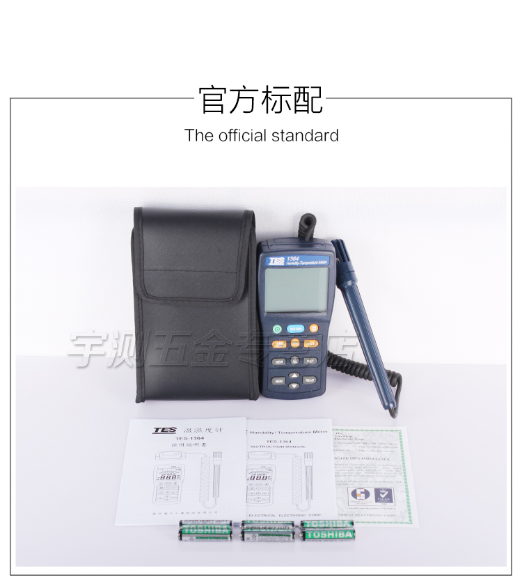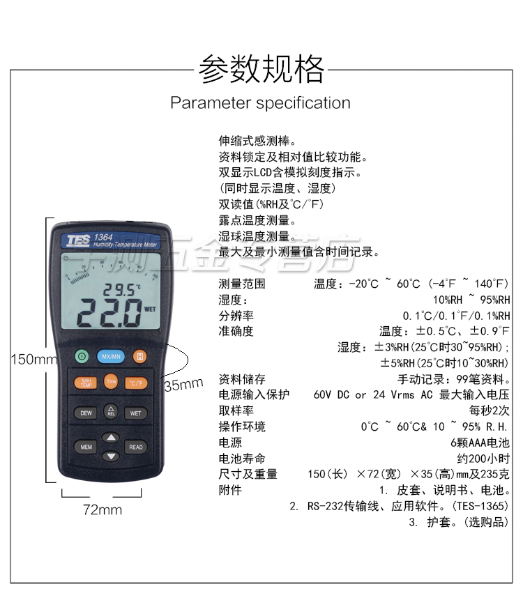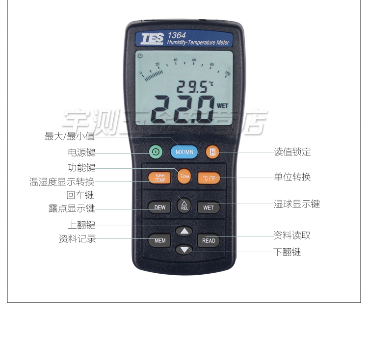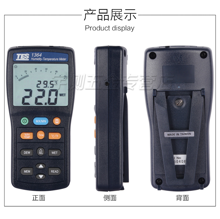 双读值(%RH及℃/℉)记忆储存容量达15001笔。(TES-1365)