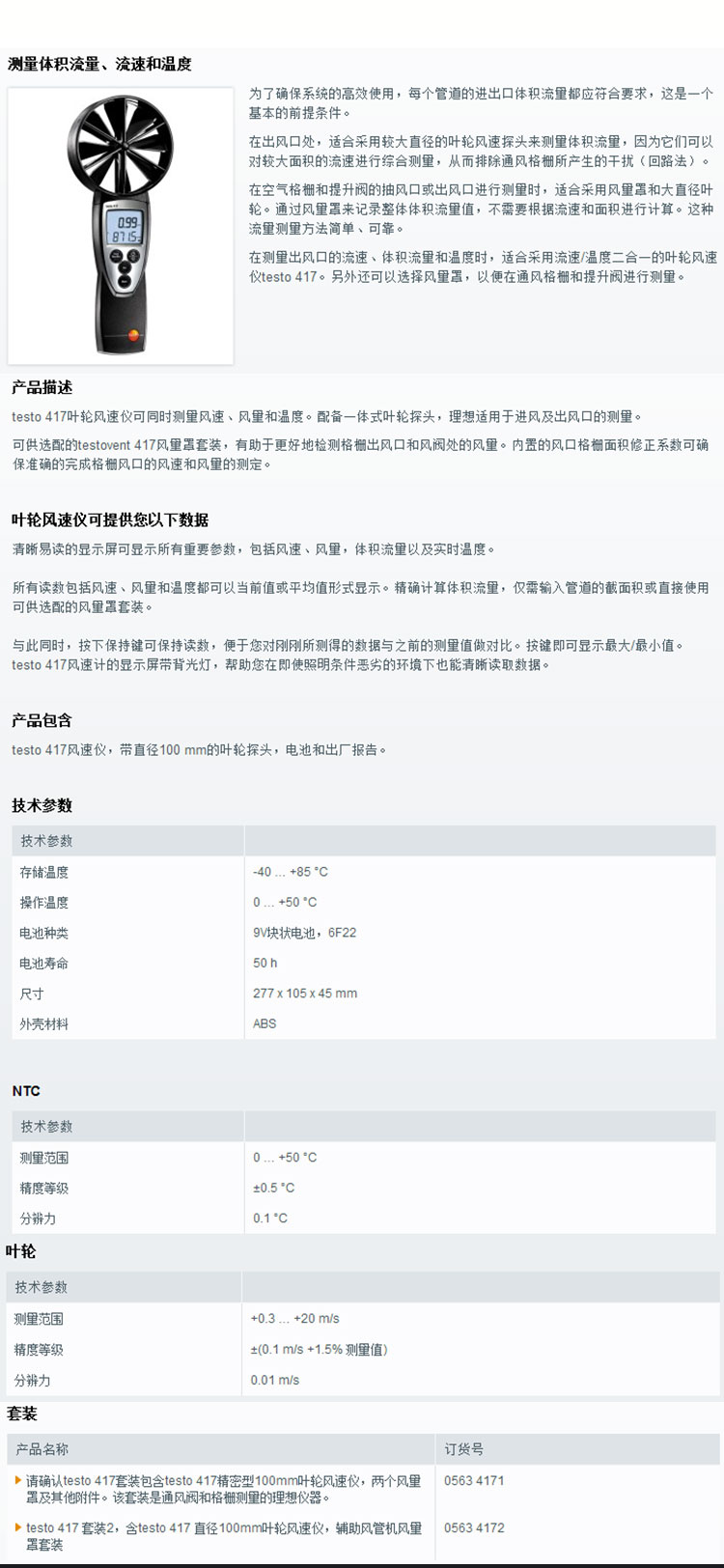 德图Testo-417叶轮式风速仪表直径100mm叶轮探头风速计