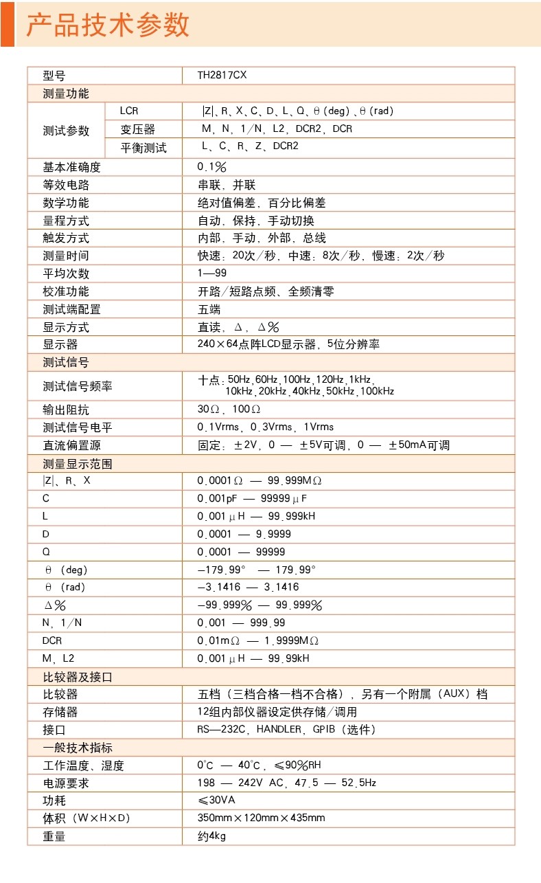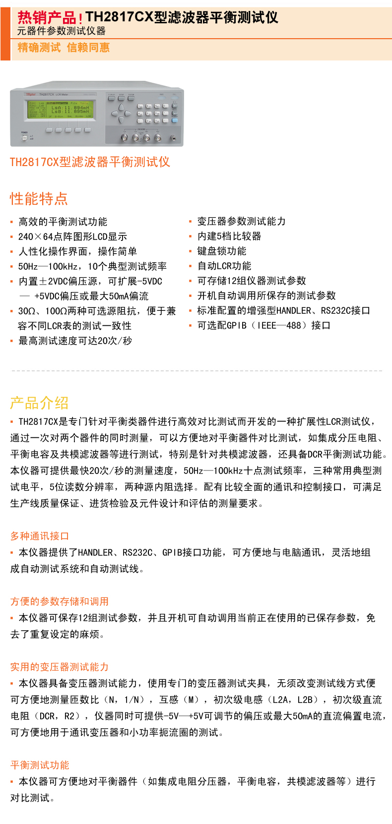 常州同惠TH2817CX滤波器平衡LCR数字电桥元器件参数测试仪100kHz